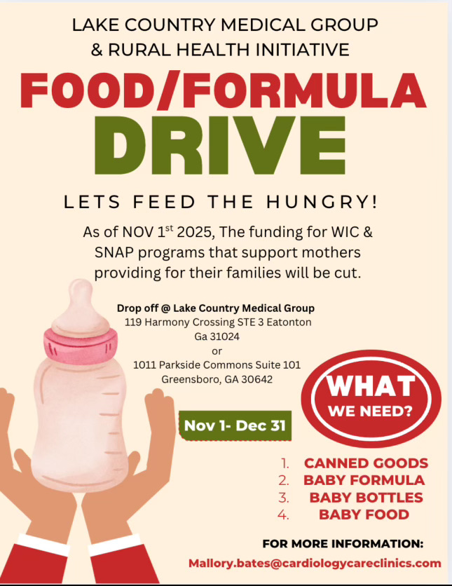 Due to the government shutdown, many households who rely on WIC and SNAP benefits are facing heartbreaking uncertainty about their next meal. Lake Country Rural Health Initiative is hosting a Food/Formula Drive to support local families affected by this crisis. If you all want to help out during the holiday season, you can donate canned foods, baby formula, baby bottles, and/or baby food. I can come by anytime from November 1-December 31 to pick up any donations y’all may have and bring them to the clinic. Thanks!!