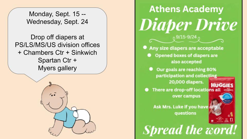 If the Upper School brings in 50 packages of diapers, we will have a dress down day! Diapers due THIS WEDNESDAY!